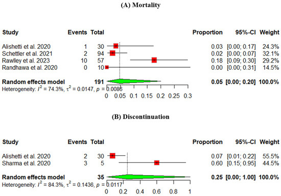 The discontinuation rate was measured across two studies, and the pooled percentage was 25%, 95% CI [0, 100] (Figure 3B).