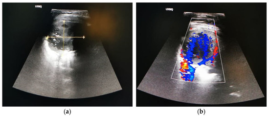 Two-year old male child with pulmonary abscess: thoracic ultrasonography showing (a) round–oval lesion with heterogeneous anechoic content, with no adjacent pleural effusion; (b) absent intrinsic vascular signal, but peripheral parietal vascular tract is present, suggestive of underlying congenital pulmonary airway malformation.