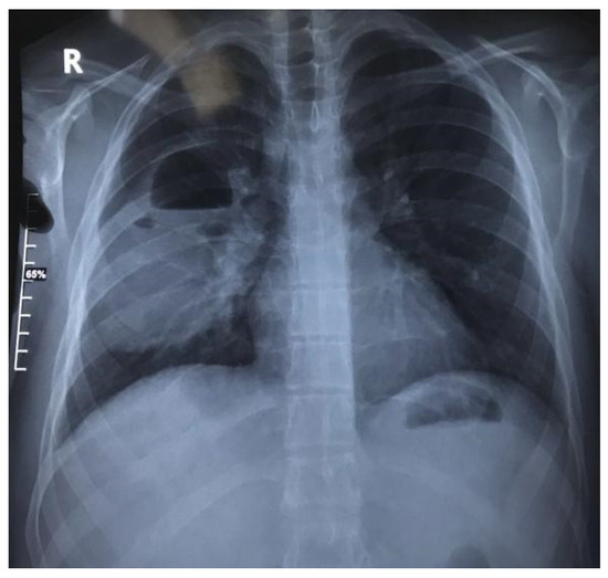 Chest X-ray revealed an oval-shaped, well-circumscribed opacity in the right hemithorax, with thick walls and containing an air–fluid level. Satellite lymphadenopathies were observed in the right hilum (Figure 6).