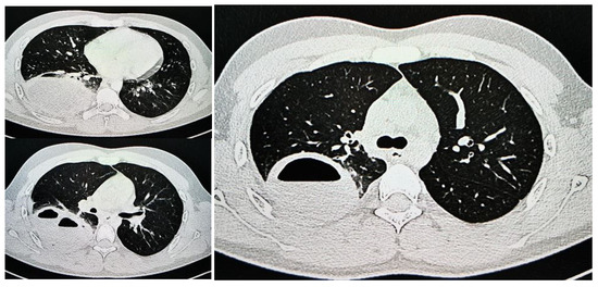Despite treatment, fever, pulmonary auscultatory changes, and the inflammatory syndrome, although decreasing, persisted initially (Table 1). A subsequent CT scan performed after 7 days of antibiotic therapy confirmed the presence of the mass in the right lower lobe, measuring approximately 53 mm × 47 mm × 50 mm, with heterogeneous content circumscribed by thick walls. Two additional cystic lesions, measuring 13 mm and 7 mm, respectively, were identified nearby without clear demarcation (Figure 3).