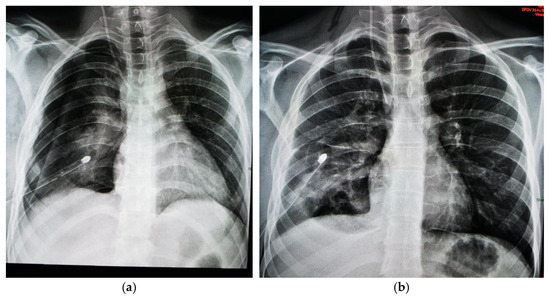 Seventeen-year-old male adolescent with pulmonary abscess: (a) post-operative pneumothorax requiring pleural drainage, initially with poor lung expansion; (b) after three days, right lung expanded adequately.