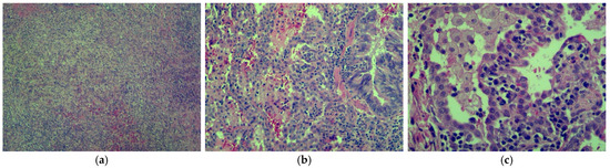 Seventeen-year-old male adolescent with pulmonary abscess—histopathologic results: (a) 4× magnification objective: disorganized architecture with alveoli and bronchioles not visible, replaced by fibroblastic reaction and mixed inflammatory infiltrate, indicative of abscess formation; (b) 10× magnification objective: mixed inflammatory infiltrate (lymphoplasmacytes, neutrophils, eosinophils, and macrophages) in interalveolar septa and bronchial epithelium; (c) 20× magnification objective: alveoli filled with macrophages and thickened interalveolar septa with inflammatory infiltrate consisting of lymphocytes, plasma cells, neutrophils, and eosinophils.