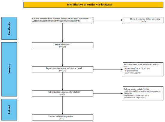 Figure 1 provides an illustration of the screening process. Initially, 321 studies were found in the numerous database search results; 258 articles were discarded after their titles and abstracts were reviewed, where 194 of these studies did not test tDCS in MS, 53 were duplicates, and 11 were research reviews. A comprehensive full-text analysis was carried out on the remaining 63 papers; 50 studies were then excluded because they did not investigate the effect of tDCS on depression or anxiety in MS patients, 1 was excluded because it contained incomplete outcome data, and 1 was excluded because it was written in a language other than English. An extensive analysis of the contents led to the determination that eleven (11) articles met the criterion for admission.