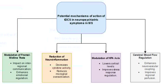 tDCS applied to the left DLPFC in patients with depression has been shown to reduce markers of neuroinflammation [82,83]. One potential mechanism involves the reduction in the secretion of cytokines by tDCS, which activate the HPA axis and disrupt the serotonin and norepinephrine signaling pathways, crucial for mood regulation. Decreasing these cytokines may lead to improvements in both depressive and anxiety symptoms. Additionally, tDCS may attenuate microglial activation in the brain. Microglia, when overactivated, produce excessive amounts of pro-inflammatory cytokines and contribute to neurodegeneration. This neuroinflammatory state in MS, particularly in progressive forms, has been associated with synaptic alterations and neurodegenerative markers. Reducing microglial activity by tDCS might decrease the inflammatory response and protect against further neurodegeneration, providing neuroprotective effects that mitigate both MS progression and depressive symptoms.