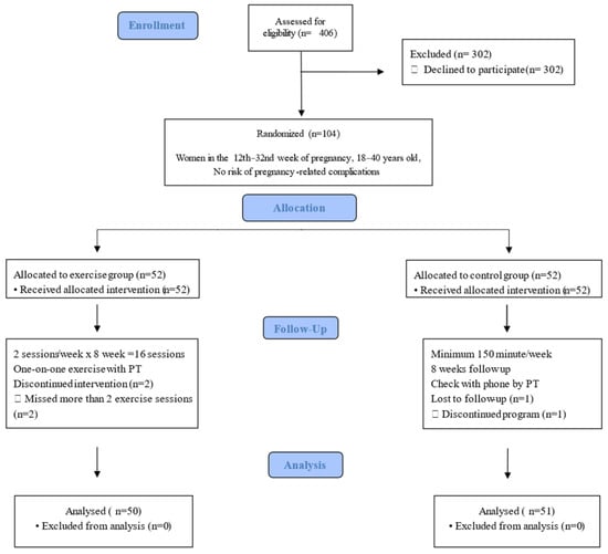 For the exercise group, a one-on-one clinical exercise program was applied with a physiotherapist for a total of 16 sessions two days a week for eight weeks. Each session lasted 45 min. A clinical exercise program suitable for pregnant women was organized by paying attention to the week of pregnancy [2,15,16]. The clinical exercise program included core stabilization exercises, exercises involving the pelvic floor muscles and the muscles surrounding the hip, and therapeutic exercises combined with breathing to strengthen the lower extremity muscles (Supplementary Materials). Each session included warm-up–load–cool-down periods. Free weights, resistance bands, or body weights were preferred for strengthening exercises [15]. According to the recommendations of the American College of Sports Medicine (ACSM), strength training with an elastic band was adjusted according to the RPE. According to the Modified Borg Scale, loading exercises were performed with a score of 2–3, corresponding to moderate-intensity exercise [14].