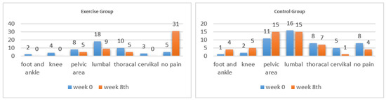Pain scores increased statistically significantly in the control group and decreased in the exercise group (interaction p < 0.0001). While the pain level of the exercise group was higher than that of the control group at baseline (p = 0.023), the pain level of the control group was higher than that of the exercise group at week 8 (p < 0.001) (Table 4). In the exercise group, while 5 people had no pain at the beginning, 31 had no pain in the eighth week. The lumbar region in both groups was the most common site of pain localization. The second most common pain localization site was in the thoracic and pelvic regions (Figure 2).