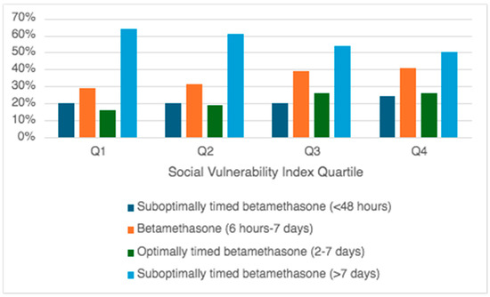 Our findings were somewhat unanticipated, and may reflect either that patients of higher SVI quartiles are a higher risk group for preterm birth, or that patients of lower social vulnerability are overtreated with betamethasone when they are not truly at a high risk of preterm birth. Additionally, within this study’s healthcare system, patients of higher SVI quartiles who receive government-funded insurance (Medicaid) are often cared for by medical trainees who may be more likely to adhere to institutional guidelines for antenatal corticosteroids compared to private practitioners or community physicians.