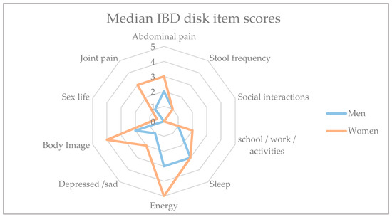 Radar plot of median scores of IBD disk item topics where problems of patients arose (range 0 to 10); higher scores are worse. Women showed overall worse item scores than men in all topics except social interaction. Significantly worse outcomes for female patients with IBD compared with males were observed in the topics of abdominal pain, sleep, energy, depressed/sad state, body image, and joint pain (see Table 1).