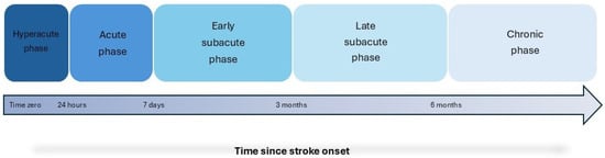 MT has been widely used in clinical practice by scientists involved in the rehabilitation process of patients with motor deficits of the upper limb due to stroke. MT has been applied in different stages of stroke, in various clinical settings and by using diverse therapeutic protocols [15,16,17]. Accordingly, the aim of this narrative review is to summarize existing evidence regarding the effects of MT on the upper limb’s motor function in post-stroke patients and to further explore its role when applied in different phases of stroke. For the purpose of this narrative review, we searched for relevant articles via PubMed (MEDLINE) database using a combination of keywords, such as “mirror therapy”, “stroke”, “upper limb/extremity/arm”, “motor function”, “motor deficits/impairment”, “rehabilitation”. The cited bibliography of the retrieved articles was also searched for further relevant sources. Relevant MT studies will be presented based on the phase of stroke during which MT was applied. The temporal phases of stroke are presented in Figure 1 and are categorized as follows: hyperacute phase (0–24 h); acute phase (1–7 days); subacute phase divided into early (7 days–3 months) and late (3 months–6 months) subacute phase; and chronic phase (>6 months) [18].