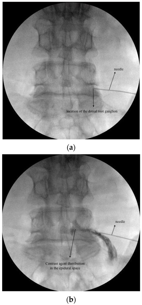 For TESI, the needle tip was retracted 2–3 mm to realign in the safe triangle following DRG PRF. Epidural spread was verified using contrast medium (Omnipaque 300, GE Healthcare, Dublin, Ireland). A total of 5 mL (4 mg/1 mL dexamethasone and 4 mL 0.9% NaCl) was injected at each target level (Figure 1a,b).