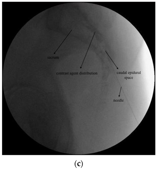 Under fluoroscopic guidance, the caudal epidural space was visualized in the lateral view. Following skin infiltration with 1 mL 2% lidocaine, a 22-gauge spinal needle was advanced to the caudal epidural space. After visualizing appropriate contrast distribution, a total of 10 mL (40 mg/1 mL methylprednisolone acetate and 9 mL 0.9% NaCl) was injected (Figure 1c).