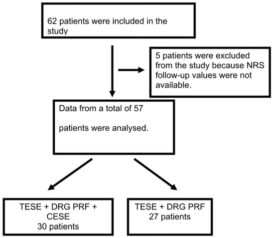 During the 17-month study period, a total of 62 patients underwent either DRG PRF and TESI or DRG PRF, TESI, and CESI treatments for RLDH; 5 of these patients were excluded from the study because follow-up NRS scores were not available. Therefore, data pertaining to a total of 57 patients were examined (30 patients in the DRG PRF+TESI+CESI group and 27 in the DRG PRF+TESI group) (Figure 2).