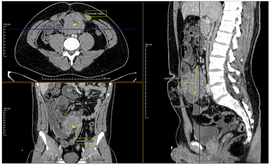The family history revealed no instances of lymphomas or neoplasia. One year prior to the tumor’s detection, the boy was taken to the emergency department (ED) due to rectal and abdominal pain accompanied by bilious vomiting. After admission to the pediatric surgery ward, the patient was transferred to the operating room, and emergency surgery was performed with a median laparotomy. An ileocecal intussusception was decelerated. Disinvagination, appendectomy, and lavage were performed. Despite local edema, no pathological lead point was identified during the procedure. Except for the appendix, no biopsies were made. The specimen did not show any pathological changes. The recovery was favorable.
