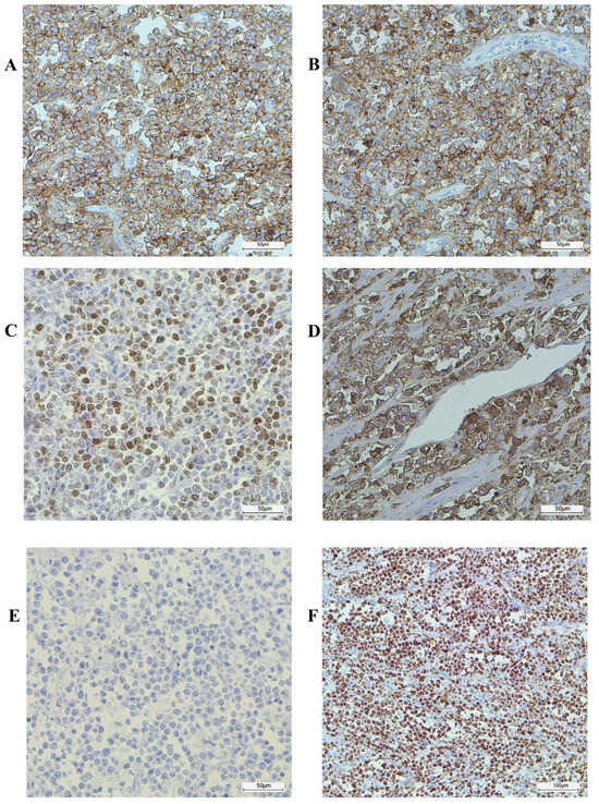 Tumor immunohistochemistry (DAB chromogen). The tumor cells showed a characteristic immunophenotype, being positive for CD20 (A) and CD10 (B), BCL-6 (C), and immunoglobulin M (D) without BCL-2 expression (E). A high proliferation rate was observed, with a Ki67 proliferation fraction approaching 100% (F).