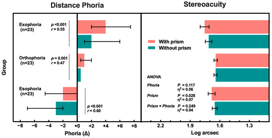Stereoacuity without prism was comparable among the three phoria groups (1.67 ± 0.13 log arcsec, equivalent to 46.8″) and showed a small worsening with prism insertion (1.69 ± 0.17 log arcsec, equivalent to 49.4″), without any interaction between prism and phoria (Figure 1). Detailed analysis can be found in the Supplementary Materials (Section S6.2 and Tables S3 and S4).