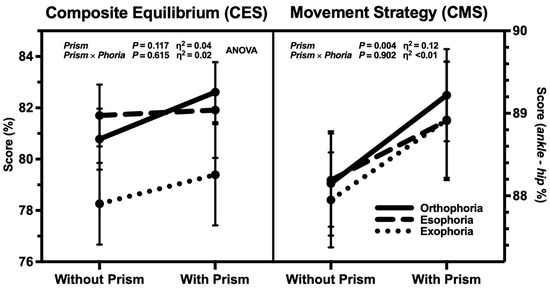 Figure 2. Composite equilibrium (CES) and composite movement strategy scores (CMS) without (at baseline) and with prism, sorted by baseline phoria. A higher CSS denotes a better performance (less sway); a higher CMS indicates a more predominant ankle strategy (versus hip). Dot and bar represent mean and standard error, respectively. Two-way ANOVA statistical significance (P) and partial effect size (η2) of main effect (Prism) and interaction (Prism × Phoria) showed only a significant shift of CMS toward ankle strategy for all groups.