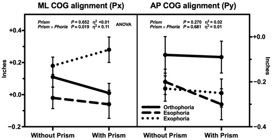 Figure 3. Medio-lateral (ML/Px) and antero-posterior (AP/Py) projection of center of gravity (COG) without (at baseline) and with prism, sorted by baseline phoria. Right and forward displacements are positive, left and backward negative. Dot and bar represent mean and standard error, respectively. Two-way ANOVA statistical significance (P) and partial effect size (η2) of main effect (Prism) and interaction (Prism × Phoria) showed no significant displacement of COG, though COG-Px displacement of exophoric subjects was divergent (rightward) from esophoric and orthophoric subjects (leftward).