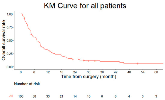 Kaplan–Meier survival curve showing the overall survival of 106 patients with metastatic cervical spine cancer.