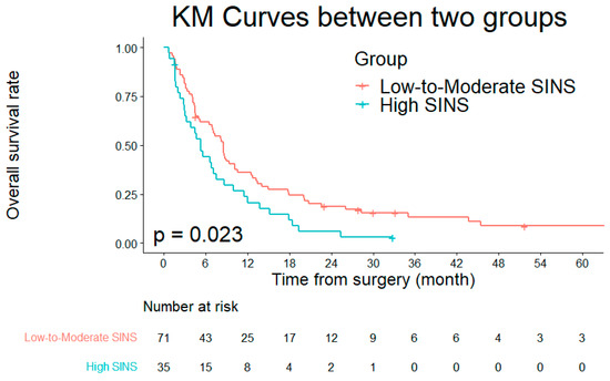 Continuous variables are expressed as means with standard deviations or medians with interquartile ranges, as appropriate. Categorical variables are presented as frequencies and percentages. Comparisons between the high and low-to-moderate SINS groups were conducted using the independent two-sample t-test or Mann–Whitney U test for continuous variables and the chi-square test or Fisher’s exact test for categorical variables. Survival outcomes were analyzed using Kaplan–Meier survival estimates, and the log-rank test was used to compare survival distributions between the groups. Median OS was reported with a 95% confidence interval (CI). Univariate and multivariate Cox proportional hazards regression analyses were conducted to identify independent predictors of survival. Variables with p-values < 0.10 in univariate analysis were included in the multivariate model. Hazard ratios (HRs) with 95% CIs were calculated to quantify the strength of the association. Postoperative changes in ECOG-PS were analyzed using paired comparisons of pre- and postoperative scores within each group using chi-squared analysis. Statistical analyses were performed using SPSS (version 27.0; SPSS Inc., Chicago, IL, USA), and statistical significance was set at p < 0.05.