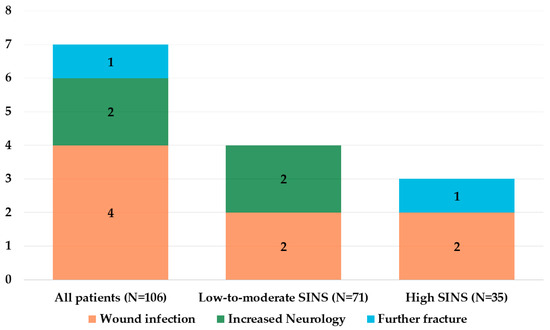 The mean operation time for all patients was 5.6 ± 2.2 h, with the low-to-moderate SINS group having a longer mean operation time compared to the high SINS group (5.9 ± 2.5 h vs. 5.0 ± 1.5 h; p = 0.020) (Table 4). However, there was no significant difference in the estimated blood loss between the two groups (low-to-moderate SINS: 684.5 ± 1215.9 mL vs. high SINS: 553.4 ± 473.4 mL; p = 0.541). Postoperative complications were comparable between the groups (Figure 3). The overall rate of revision surgeries due to complications was low in both groups, with four patients (5.6%) in the low-to-moderate SINS group and three patients (8.6%) in the high SINS group requiring additional interventions (p = 0.682). The overall rate of wound infection was 3.8%, with no significant difference between the groups (p = 0.597). In the low-to-moderate SINS group, two patients (2.8%) experienced wound infections compared to two patients (5.7%) in the high SINS group. Further fractures were rare, occurring in only one patient (2.9%) in the high SINS group, whereas no cases were reported in the low-to-moderate SINS group (p = 0.330). Tumor relapse-associated neurological deterioration was noted in two patients (2.8%) in the low-to-moderate SINS group, whereas no cases occurred in the high SINS group (p = 0.999).