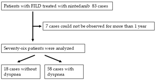 Among the 76 patients, the incidences of discontinuing nintedanib for all causes and because of side effects were 26 (34%) and 20 (26%) patients throughout the overall period. Similarly, annual discontinuation was experienced in 10 (13%) patients after starting nintedanib and was due to side effects in all of these patients. Interruption and dose reduction in nintedanib were experienced in 27 (36%) and 52 (68%) patients throughout the overall period. Causes of discontinuing nintedanib were worsening FILD in seven (9%) patients, diarrhea in nine (12%), liver toxicity in three (4%), nausea in three (4%), and appetite loss, fatigue, worsening performance status, thrombocytosis, proteinuria, pulmonary hypertension, and edema in one (1%) each. The incidences of discontinuation, interruption, and dose reduction and the therapeutic period showed no significant differences between patients with and without dyspnea. The present study showed no difference in the tolerability of nintedanib therapy according to the presence of dyspnea in patients with FILD.