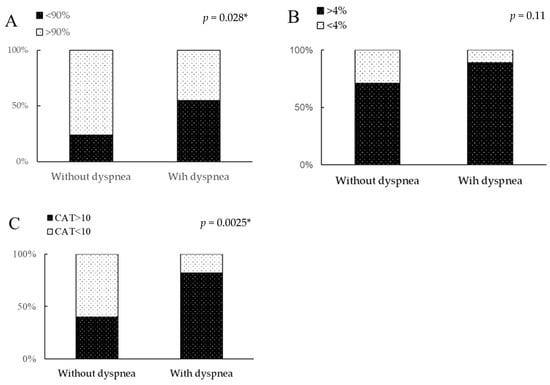 Comparison of desaturation and patient-reported outcomes among patients with FILD with versus without dyspnea. Comparison of (A) lowest and (B) highest decrease in SpO2 in the 6MWT and (C) CAT score between non-dyspnea and dyspnea groups. Cut-off levels were set at 90% of the lowest SpO2 in the 6MWT, 4% for the decrease in SpO2 in the 6MWT, and 10 for the CAT score as prognostic factors of FILD or chronic obstructive pulmonary disease based on previous reports. 6MWT, 6-min walk test; CAT, chronic obstructive pulmonary disease assessment test. * p < 0.05 is regarded as statistically significant.