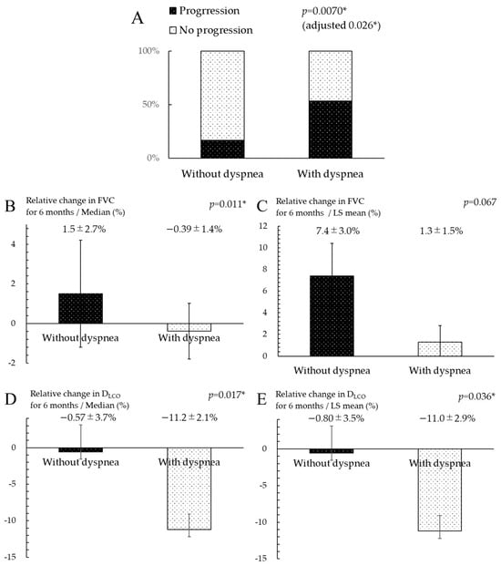 A comparison of the patients’ outcomes between the non-dyspnea and dyspnea groups is shown in Table 2. The median observation period was 861.0 (671.5–1488.5) days after starting nintedanib. Among the 76 patients, 24 (32%) and 17 (22%) patients died from any cause and from FILD, respectively. Compared with the dyspnea group, the non-dyspnea group showed significantly longer OS and significantly lower mortality from any cause and FILD (p < 0.05). In total, 34 (45%) of 76 patients exhibited annual progression (Table 2). Among the 76 patients, annual progression of FILD occurred in 3 (17%) of 18 patients in the non-dyspnea group and 31 (53%) of 58 patients in the dyspnea group, with a significant difference according to Fisher’s exact test (p = 0.0070). In a similar comparison of the components of annual progression of FILD, only the incidence of a >15% decrease in DLCO was significantly lower in the non-dyspnea group than in the dyspnea group (p = 0.026); the other components showed no significant differences between the two groups. Moreover, the incidence of annual progression of FILD was also significantly lower in the non-dyspnea group than in the dyspnea group after adjusting for covariates (adjusted p = 0.026) (Figure 3A). Comparisons of the relative decrease in FVC and DLCO over 6 months are shown in Figure 3B–E. The relative decrease in FVC (median ± SE, 1.5% ± 2.7% vs. −0.39% ± 1.4%; p = 0.011) and DLCO (median ± SE, −0.57% ± 3.7% vs. −11.2% ± 2.1%; p = 0.017) were significantly slower in the non-dyspnea group than in the dyspnea group. After adjusting for covariates, the relative change in DLCO was also significantly slower in the non-dyspnea group than in the dyspnea group (LS mean ± SE, −0.80% ± 3.5% vs. −11.0% ± 2.9%; p = 0.036). Similarly, the relative change in FVC tended to be slower in the non-dyspnea group than in the dyspnea group (LS mean ± SE, 7.4% ± 3.0% vs. 1.3% ± 1.5%; p = 0.067), but not significantly. Comparisons of the relative decrease in pulmonary function over 12 months are shown in Figure 3F–I. The relative decrease in DLCO was significantly slower in the non-dyspnea group than in the dyspnea group (median ± SE, −1.5% ± 4.0% vs. −16.7% ± 2.1%; p = 0.0040), but the relative change in FVC showed no difference between the two groups (median ± SE, 0.85% ± 3.2% vs. −2.0% ± 1.8%; p = 0.17). After adjusting for covariates, the relative change in DLCO tended to be slower in the non-dyspnea group than in the dyspnea group (LS mean ± SE, −7.0% ± 4.7% vs. −16.7% ± 2.4%; p = 0.059), but not significantly. Similarly, there was no significant difference in the relative change in FVC between the non-dyspnea and dyspnea group (LS mean ± SE, 0.76% ± 4.0% vs. −2.0% ± 2.2%; p = 0.54).