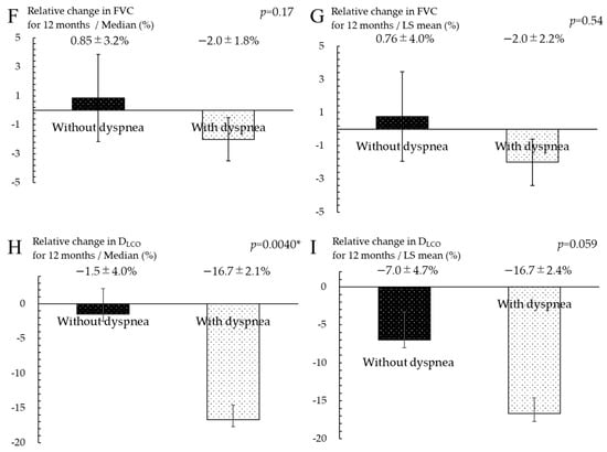 Comparison of progression among patients with FILD with versus without dyspnea. (A) Incidence of annual progression (defined as >10% relative decrease in FVC or 15% decrease in DLCO, development of acute exacerbation, or death) was compared among patients with FILD with versus without dyspnea using Fisher’s exact test. Adjustment for covariates including age, gender, FVC, DLCO, and diagnosis with IPF as prognostic factors based on previous reports was performed using logistic regression analysis. We compared the relative decrease in (B,C) FVC and (D,E) DLCO over 6 months using the (B,D) Wilcoxon rank-sum test or (C,E) multiple regression analysis. Similarly, we compared the relative decrease in (F,G) FVC and (H,I) DLCO over 12 months using the (F,H) Wilcoxon rank-sum test or (G,I) multiple regression analysis. Decreases in FVC and DLCO are shown as (B,D,F,H) median ± SE or (C,E,G,I) LS mean ± SE. Adjustment for covariates including age, sex, FVC, DLCO, and diagnosis with IPF was performed using multiple regression analysis. FILD, fibrosing interstitial lung disease; FVC, forced vital capacity; DLCO, diffusing capacity of the lung for carbon monoxide; IPF, idiopathic pulmonary fibrosis; SE, standard error; LS, least squares. * p < 0.05 is regarded as statistically significant.