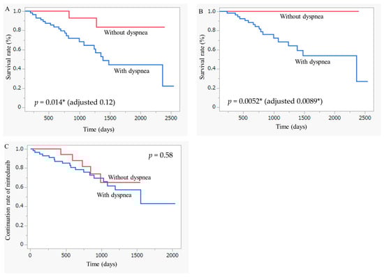 Comparison of survival between patients with FILD with versus without dyspnea. Kaplan–Meier curves for mortality from (A) any cause and (B) FILD after start of nintedanib between patients who had FILD with versus without dyspnea using the log-rank test. Adjustment for covariates including age, sex, FVC, DLCO, and diagnosis with IPF was performed using a Cox proportional hazard model. (C) Kaplan–Meier curves comparing the therapeutic period of nintedanib between patients with FILD with versus without dyspnea using the log-rank test. FILD, fibrosing interstitial lung disease; FVC, forced vital capacity; DLCO, diffusing capacity of the lung for carbon monoxide; IPF, idiopathic pulmonary fibrosis. * p < 0.05 is regarded as statistically significant.