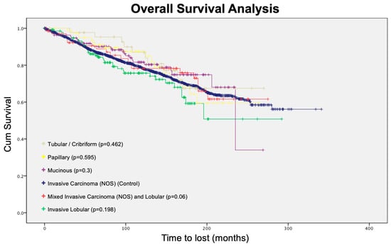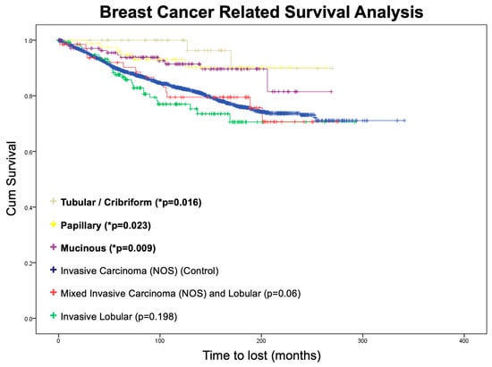 Breast cancer-related survival analysis was performed using the Kaplan–Meier method (Figure 2). Three groups of patients showed significantly better breast cancer-related survival when compared with invasive carcinoma (NOS) (i.e., the control group), namely mucinous carcinoma (p = 0.009), papillary carcinoma (p = 0.023), and pure tubular/cribriform carcinoma (p = 0.016).