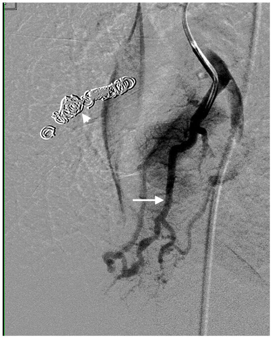 - Trerotola, S.O.; Pyeritz, R.E. Does use of coils in addition to amplatzer vascular plugs prevent recanalization? AJR Am. J. Roentgenol. 2010, 195, 766–771. [Google Scholar] [CrossRef] [PubMed]