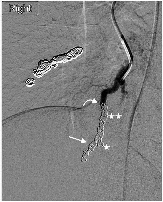 Right-lower-lobe simple PAVM treated with embolization of the nidus (straight arrow) and distal feeding artery (curved arrow) using 3 mm × 12 cm Interlock coils (×5) (star) and 2 mm × 6 cm Interlock coils (×2) (double star) (non-HVDNF coils) with complete occlusion. Note the relative density of the coil pack.