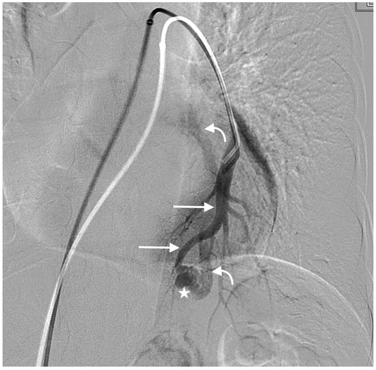 - Pollak, J.S.; Saluja, S.; Thabet, A.; Henderson, K.J.; Denbow, N.; White, R.I. Clinical and Anatomic Outcomes after Embolotherapy of Pulmonary Arteriovenous Malformations. J. Vasc. Interv. Radiol. 2006, 17, 35–45. [Google Scholar] [CrossRef]