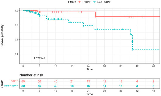 Kaplan–Meier curve of de novo PAVM embolizations, including 80 treated with HVDNF coils and 80 propensity-matched non-HVDNF coils. HVDNF treatment group demonstrated higher recurrence-free survival rate relative to non-HVDNF control group (log-rank test, p = 0.023).