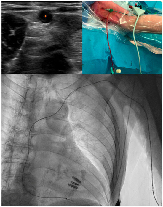 Example of a temporary pacing lead in a left upper arm vein. Upper left: Ultrasound-guided visualization of the vein for temporary pacemaker access. Asterisk denotes the vein. Upper right: 5F temporary pacing lead inserted through a 6F sheath in a left upper arm vein. Lower: Angiographic visualization of the temporary pacing lead trajectory from a left upper arm vein to right ventricular apex.