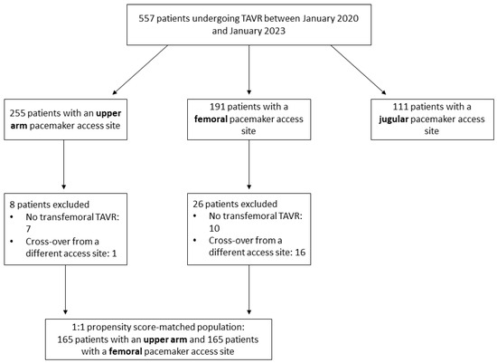 In this prospective cohort study, we examined all consecutive patients who underwent TAVR for severe symptomatic AS at the Radboud University Medical Center between January 2020 and January 2023. Furthermore, we performed a propensity score (PS)-matched analysis of only patients who underwent transfemoral TAVR with the use of an upper arm or femoral vein as a temporary pacemaker access site. Any patients who required a cross-over of the pacemaker access site were excluded from the PS matching procedure. Treatment allocation according to current guidelines on the treatment of AS was performed by a dedicated heart team. The local Medical Research Ethics Committee provided a waiver since this study did not require an ethical review.