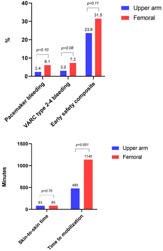Clinical outcomes in the PS-matched population are displayed in Table 3. The incidence of pacemaker access site-related bleeding was numerically lower in the upper arm cohort compared with the femoral cohort (2.4% vs. 6.1%, p = 0.10) (Figure 3). The median time to mobilization after TAVR was significantly shorter in the upper arm cohort compared with the femoral cohort (480 vs. 1140 min, p < 0.001). The mean duration of hospitalization (5.1 vs. 5.4 days, p = 0.50), skin-to-skin time (83 vs. 85 min, p = 0.75), and fluoroscopy time (19 vs. 16 min, p = 0.11) did not differ between both groups. The combined incidence of BARC type 2, 3, or 5 bleeding not related to the pacemaker access site was comparable between both groups (18.8% vs. 20.6%, p = 0.68). The VARC-3 defined early safety composite outcome was not significantly different (upper arm: 23.6% vs. femoral: 31.5%, p = 0.11).