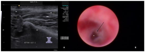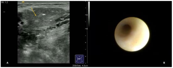 Ultrasonography (US) and sialendoscopy (SE) play an important role in the management of RAIS. Various ultrasound parameters for diagnosing RAIS have been described (hypoechoic/heterogeneous/atrophic parenchyma, duct dilation), and the findings after radioactive iodine treatment (RAIT) are time-dependent and dose-dependent [5,23,24,25,26,27,28]. This was particularly shown in a recent publication by our study group [29].