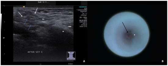 Figure 5. US (A) shows right PG with atrophic parenchyma with mixed hyper-echoic (fibrosis, white arrows) and anechoic parenchyma (fatty degeneration, blue arrows) and no duct dilation after stimulation. The corresponding SE (B) depicts a complete fibrotic stenosis without any duct lumen visible (asterix; black arrows indicate the area of stenosis; the Supplemental Video S5 shows duct obliteration after opening of the stenosis). PG, parotid gland; M, mandible; MM, masseter muscle.