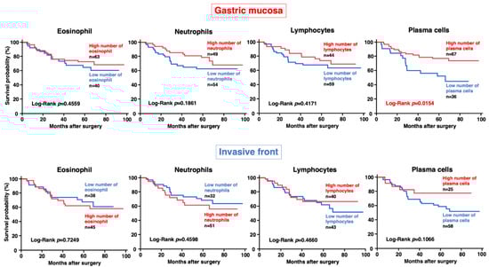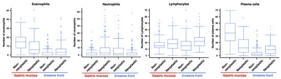 3.1. Distribution of Eosinophils, Neutrophils, Lymphocytes, and Plasma Cells per Counted Area in Gastric Cancer