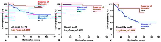 3.4. Association between Presence of Mott Cells in Neoplastic Gastric Mucosa and Survival of 178 Patients with GC