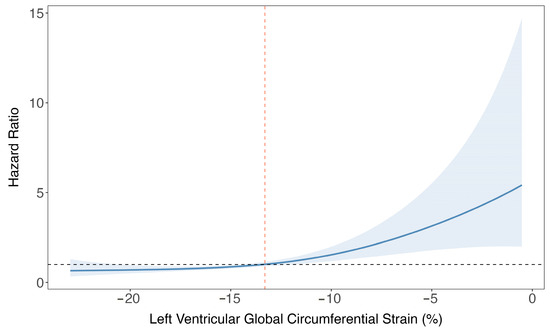 Continuous variables were presented as median (interquartile range [IQR]) or mean and standard deviation, while categorical variables were expressed as frequency (%). The normality of the distribution of the parameters was assessed using the Kolmogorov–Smirnov test. Comparisons of continuous variables were conducted through the independent samples t-test or Mann–Whitney U test, as appropriate. Categorical variables were analyzed using the chi-square test or Fisher’s exact test, as appropriate. Univariable analysis was performed using Cox proportional hazard regression to identify independent predictors of ventricular arrhythmia events. Atrial and ventricular strain predictors that demonstrated statistical significance (p < 0.05) during univariable analysis were subjected to further examination through multivariable Cox regression, adjusting for age, sex, common cardiovascular risk factors, left ventricular ejection fraction, and LGE septal location. To account for the influence of confounding factors, event-free survival from VA events at follow-up for continuous covariates that remained significant during multivariable analysis was calculated as a probability area using g-computation [37]. Changes in the hazard ratio across values of LV global circumferential strain—which demonstrated the highest hazard ratio following multivariable adjustment—were examined by fitting a spline curve. From this analysis, a cut-off of −13.3% was derived to stratify the population into low- and high-risk groups. This threshold corresponds to the point at which the hazard ratio reached or exceeded 1. All statistical tests were two-sided and a p-value < 0.05 was considered statistically significant. All statistical analyses were performed using R Statistical Software (v4.2.2; R Core Team 2022, Vienna, Austria).
