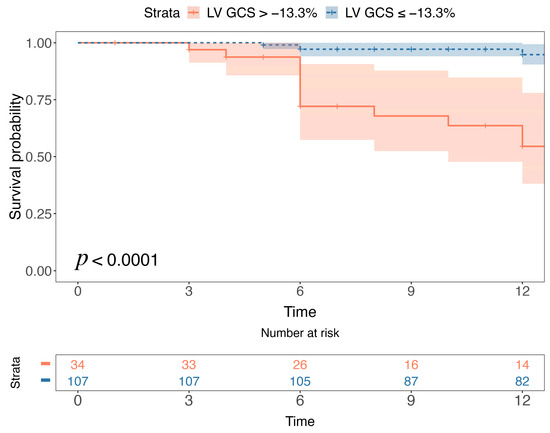 Stratification of the population in low- and high-risk groups, based on a cut-off value of −13.3% for LV global circumferential strain (Figure 3), demonstrated that patients with an LV global circumferential strain higher than −13.3% experienced significantly worse event-free survival (p < 0.0001) (Figure 4).