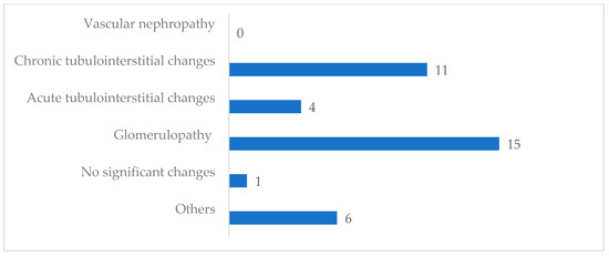 The initial histopathology diagnosis revealed chronic tubulointerstitial nephritis as the most prevalent (19.5%), followed by membranoproliferative glomerulonephritis (MPGN) (13.3%), and focal and segmental glomerulosclerosis (FSGS) (10.6%). Non-specific chronic glomerulonephritis was detected in 11% of the cohort. Pre-kidney biopsies (KBs) echography also identified two renal tumors, accounting for 1.7% of the cases (one case of Burkitt lymphoma and one case of renal cell carcinoma).