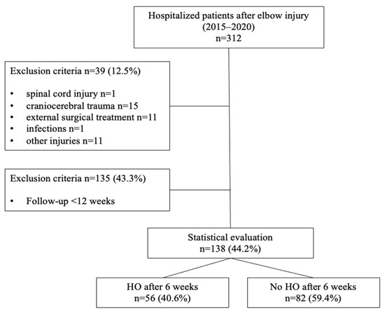 Descriptive statistics were performed using absolute and relative frequencies (n (%)) or mean ± standard deviation. The incidence of HO was measured after 6 weeks, 12 weeks, and 6 months. The incidence of the injury location at the elbow and the injured structures was calculated.