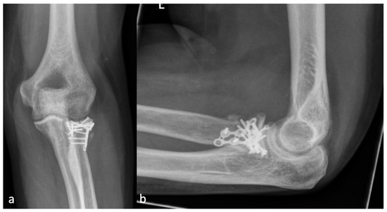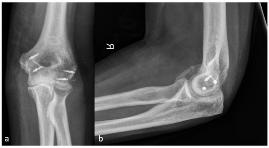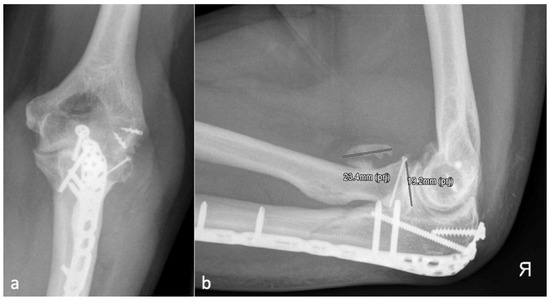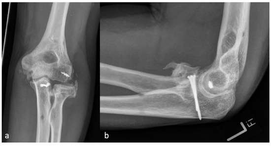 - Salazar, D.; Golz, A.; Israel, H.; Marra, G. Heterotopic ossification of the elbow treated with surgical resection: Risk factors, bony ankylosis, and complications. Clin. Orthop. Relat. Res. 2014, 472, 2269–2275. [Google Scholar] [CrossRef] [PubMed]