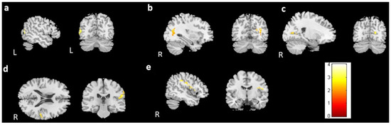 Post hoc t test results between the BH and BB groups. Significantly larger volumes of the (a) left angular gyrus, (b) left superior temporal gyrus, (c) right middle temporal gyrus, (d) right postcentral gyrus, and (e) right caudate were observed in the BH group than in the BB group. (BH > BB, corrected p value < 0.03, cluster size > 150, color bar: T scores).