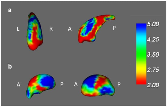 The ANCOVA results among the BB, BA, and BH groups. Among the BB, BA, and BH groups, we found significant shape alterations in the (a) right caudate and (b) right thalamus (corrected p value < 0.05, color bar: F scores, A: anterior, P: posterior).