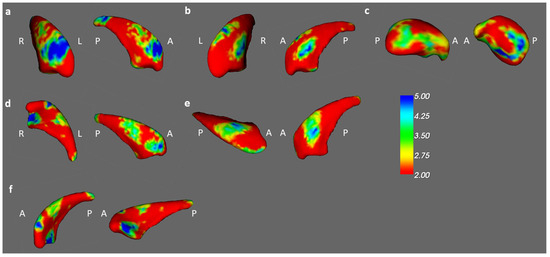 In the vertex-based shape analysis, the BB, BA, and BH groups differed significantly in the shape of their right caudates and right thalamus (Figure 5). When comparing to BB groups, there was a significant difference in concavity of BA in the bilateral caudates and right thalamus (Figure 6a–c). Compared to BH groups, we found a significant difference in concavity of BB in the bilateral caudate (Figure 6d,e). A similar finding but more pronounced difference also exists between the shapes of the left caudate between BA and BH (Figure 6f).