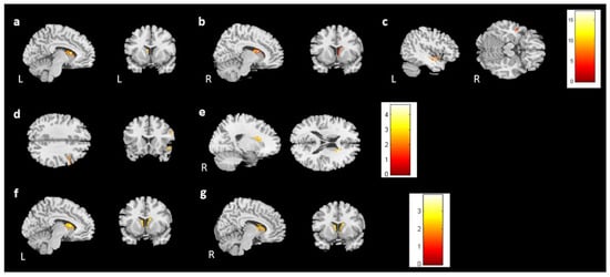 Results of ANCOVA in the BB, BA, and BH groups. Among the BB, BA, and BH groups, we found significant differences between (a) the left angular gyrus, (b,c) bilateral middle temporal gyrus, (d) right calcarine, (e) right postcentral gyrus, (f) right Rolandic operculum, and (g) left caudate. (corrected p value < 0.04, cluster size > 150, color bar: F scores).